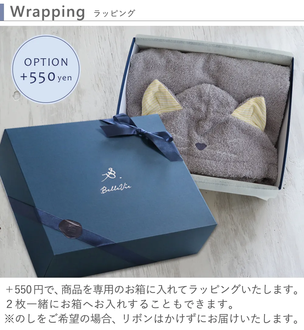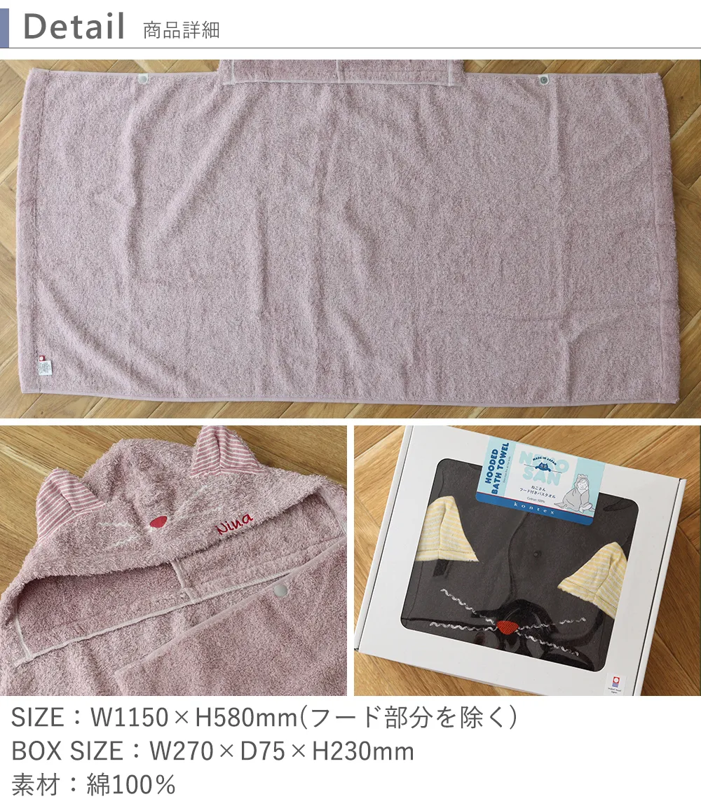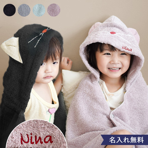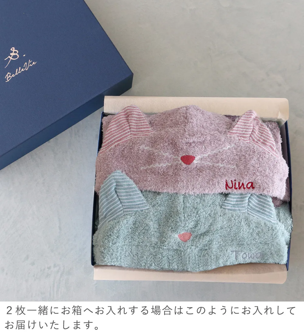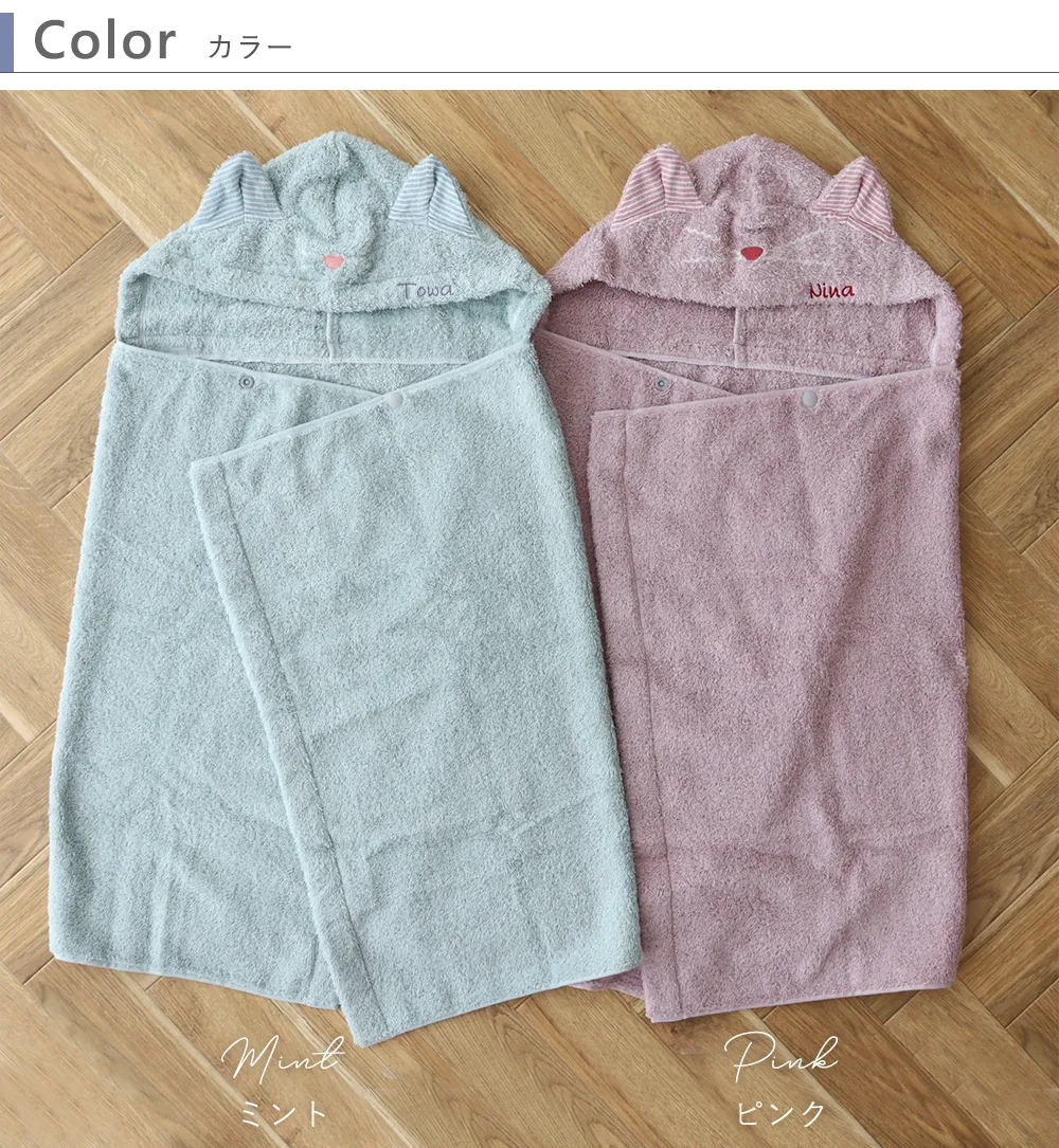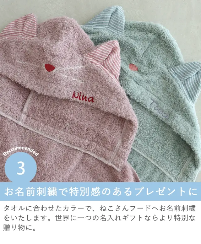 タオルに合わせたカラーで、ねこさんフードへお名前刺繍をいたします。