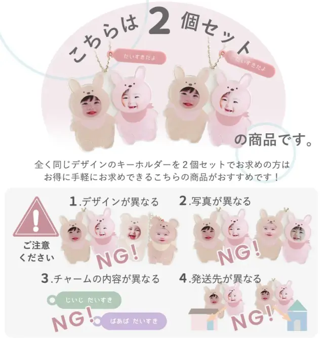 オリジナル着ぐるみキーホルダー写真入り 【ペアデザイン】【同一デザイン・2個セット】 予約期間: ご用途: 選択してください 出産内祝い 結婚内祝い ご出産祝い お誕生日祝い 自宅用 クリスマス その他(備考に記載) デザインをお選びください: 選択してください くま うさぎ ぱんだ しろくま メッセージチャームをお選びください: 選択してください A.いつもありがとう B.だいすきだよ C.じいじ だいすき D.ばあば だいすき E.ぱぱ だいすき F.まま だいすき G.THANK YOU H.LOVE YOU I.自由文 デザイン作成について: 選択してください ショップにお願いする 自分でデータを作る(台座プレゼント) 配送方法について: 選択してください メール便:日時指定×(¥0) 宅配便オプション:日時指定〇(¥550) メール便の場合は日付指定ができません: 選択してください 確認しました I.自由文をご希望の方:チャームにお入れする文字: スタイ部分の名入れ(ご希望の方のみ)左のスタイ: スタイ部分の名入れ(ご希望の方のみ)右のスタイ: 数量: 個 カートに追加