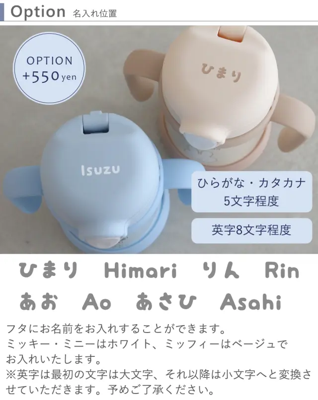 【名入れ】まほうびんのベビーストローマグ ミッキー ミニー ミッフィー 販売期間: バリエーションを選択してください: 選択してください ミッキー ミニー ミッフィー 名入れについて※必須: 選択してください 名入れ希望しない(¥0) 名入れ希望する(¥550) 有料ラッピングバッグ※必須: 選択してください ラッピング希望する(¥150) ラッピング不要(¥0) ギフトバッグ※必須: 選択してください 不要(¥0) ギフトバッグ希望する(¥220) プラスワンおもちゃ: 選択してください プラスワンおもちゃを希望しない(¥0) カミカミみつばち(¥1,050) 絵本はらぺこあおむしボードブック(¥1,100) 布絵本もぐもぐばあ(¥1,760) 布絵本いないいないばあ(¥1,760) ままごころベビーおでかけセット(¥1,980) シャカシャカウサギ(¥960) ママへ贈るプチギフト♪※必須: 選択してください プチギフトを希望しない(¥0) ディカフェコーヒー(¥2,310) プティ・スワッグ(¥1,650) YUZUハンドクリーム(¥1,540) 名入れするお名前(ひらがな5文字、英字8文字程度: 数量: 個 カートに追加